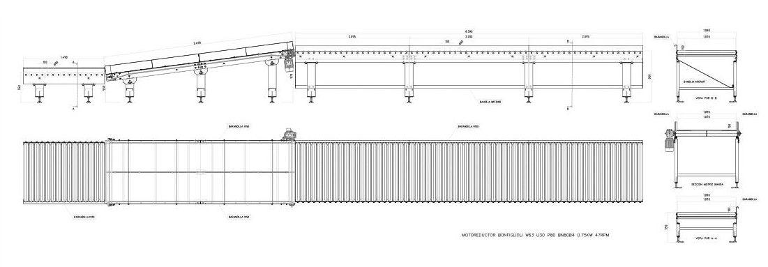 • Un transportador de rodillos de gravedad horizontal, de 6.390 x 1.070 x 950 mm. colocado a continuación del transportador de banda anterior.