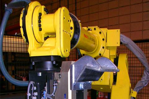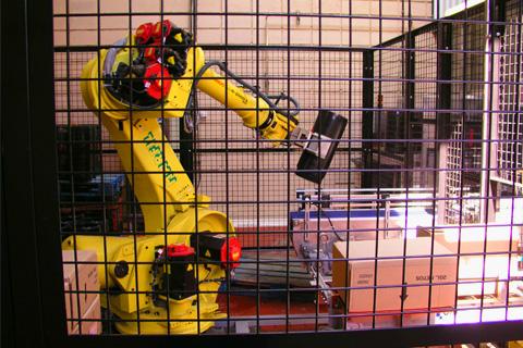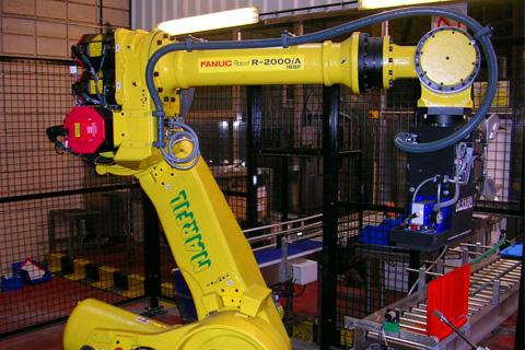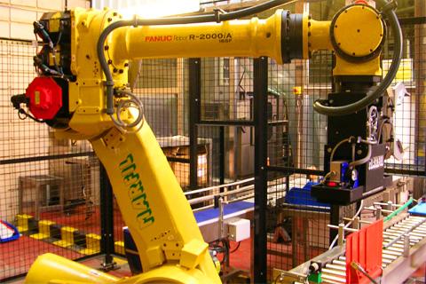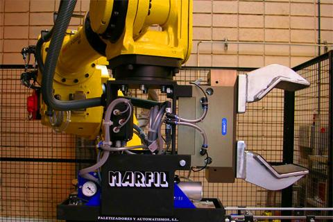 Suministro e instalación de un sistema de paletizado automático doble de cajas y bidones con robot.